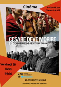 Vendredi 20 mars 14h30 Cinéma Cesare deve morire . Vendredi 20 mars 14h30 Cinéma Cesare deve morire ( César doit mourir ) Paolo et Vittorio Taviani présenté par Claude Calvié Entrée libre réservée aux adhérents . Partagez la culture italienne!